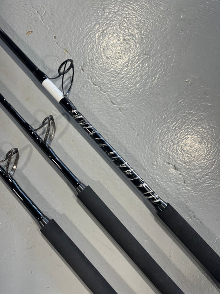Includes two 30 class trolling rods with Winthrop butts and two Avet 30 class reels. One tuna popping rod paired with a Shimano 10K spinning reel